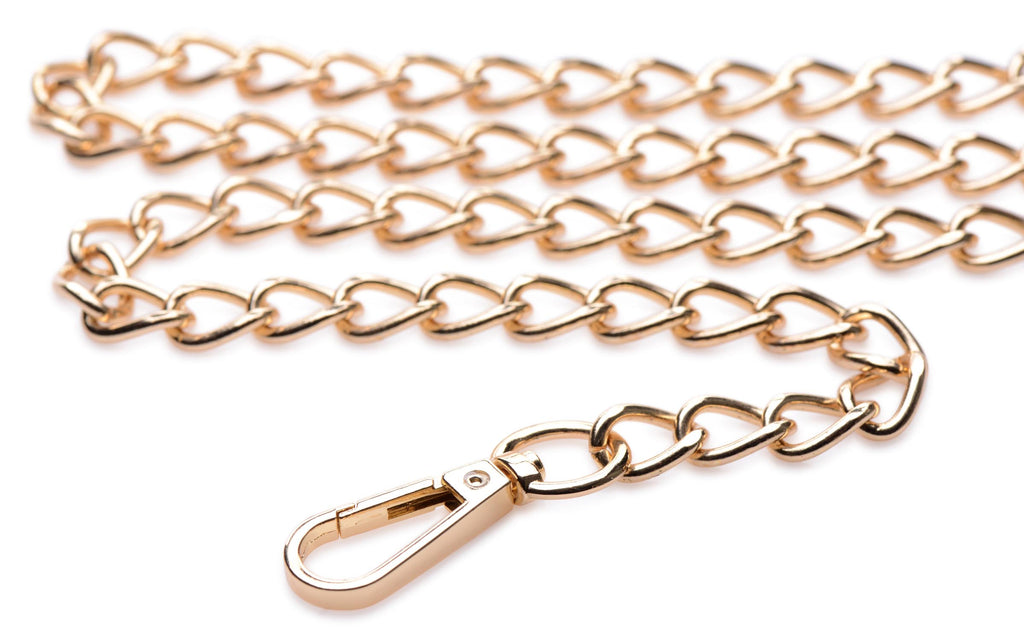 Leash up your sub in style with this Black and Gold chain leash! The black PU leather hand loop matches the dazzling gold metal hardware to provide you a bondage accessory that lets you strut your sub in style.