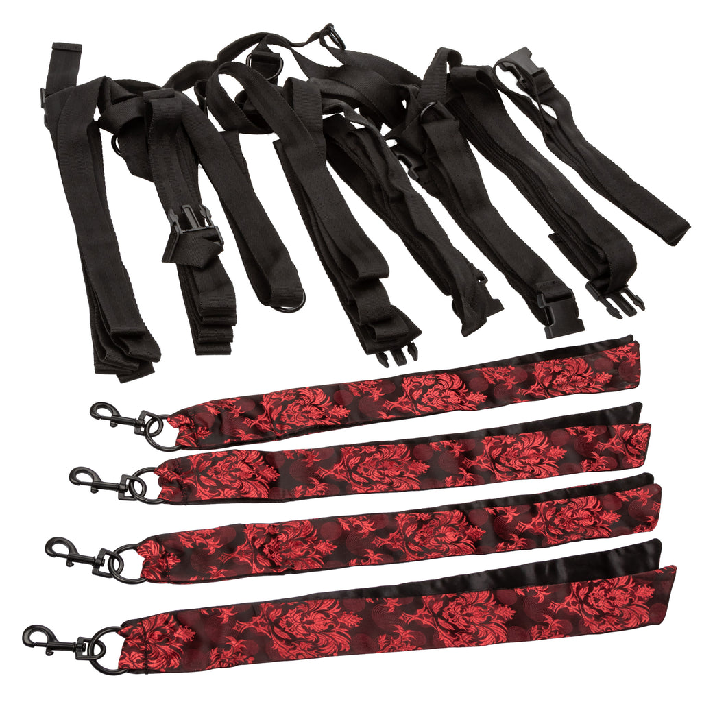 These mattress straps include 8 points of connection for you to secure the included designer inspired bondage tethers – open them for punishment, pleasure, or both! Test your knott abilities with the sexy red and black tethers, and customize the tightness of the silky smooth cuffs.