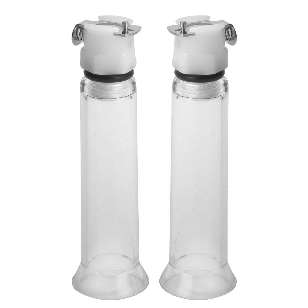 With proper use you can enlarge and stimulate your nipples using our high tech vacuum pump. The pair of cylinders is crafted from industrial grade clear acrylic. Uses the same airlock release system as in our penis pumps. A dual T connecter is recommend to enlarge both nipples evenly and to insure constant pressure. Enjoy watching your nipples grow with proper use. Enhance sensitivity of the nipples. Can be used to create great stimulation or punishment with higher pressure levels. We offer two sizes. The beginner size cylinder will make the nipples more elongated after suctioning. The advanced cylinder will make the nipple stout. Advanced size is the most popular, yet some customers choose both sizes so they have the tools to better customize the shape of their nipples.