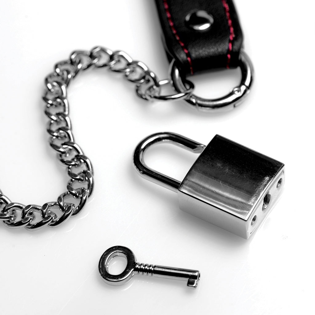 Each cuff and collar are adjustable, featuring large D-Rings so you can tie them down with additional accessories. The soft cuffs and collar are easy on the flesh, and the included chain leash makes it easy to lead your sub around while you play.