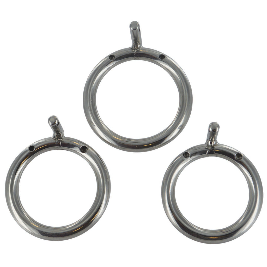 Includes: Chastity cage, 3 base rings, padlock, and 3 keys