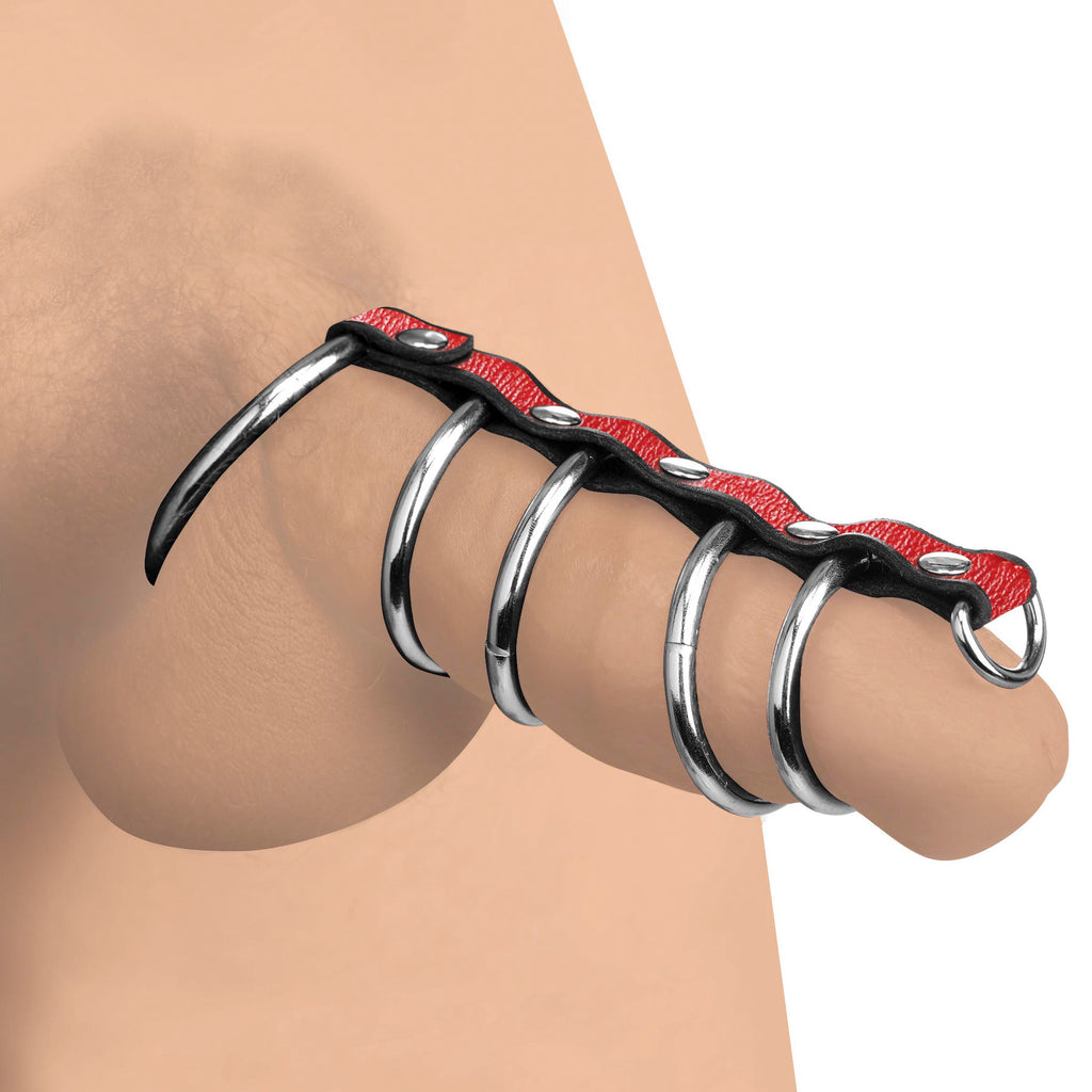 Wear a cock ring with graduated rings that look like a reinforced metal spine for your shaft. With an edgy style that both looks and feels unforgettable, enjoy how each metal ring squeezes and restricts your hard rod. The largest ring slips over the shaft and both balls to create a firm and snug constriction ring around the shaft. The rest circle the shaft with slightly smaller rings. The end D-ring is perfect for attaching a leash to if you wish to be led around.