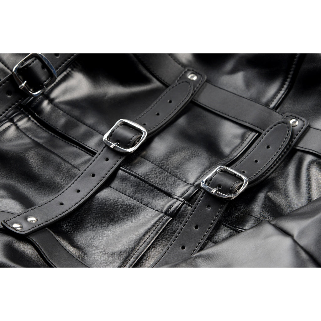 Completely restrain your sub to have your way with them! This unisex straight jacket allows you to trap your plaything with classic medical play fetish wear. Just slip your partners arms into the heavy-duty, leather-like sleeves and tighten the 5 secure buckles up the back. The dual crotch straps provide a tighter fit on both male and female bodies. Cross their arms in front of them and buckle the arm straps together behind them. A final strap wraps around their arms in the front and through loops in the jacket, providing a locking buckle that will keep your submissive completely immobilized until you are done playing with them. An O-ring on the collar allows you to attach a leash or other BDSM accessories. Restrict your sub and make them obey your every bidding!