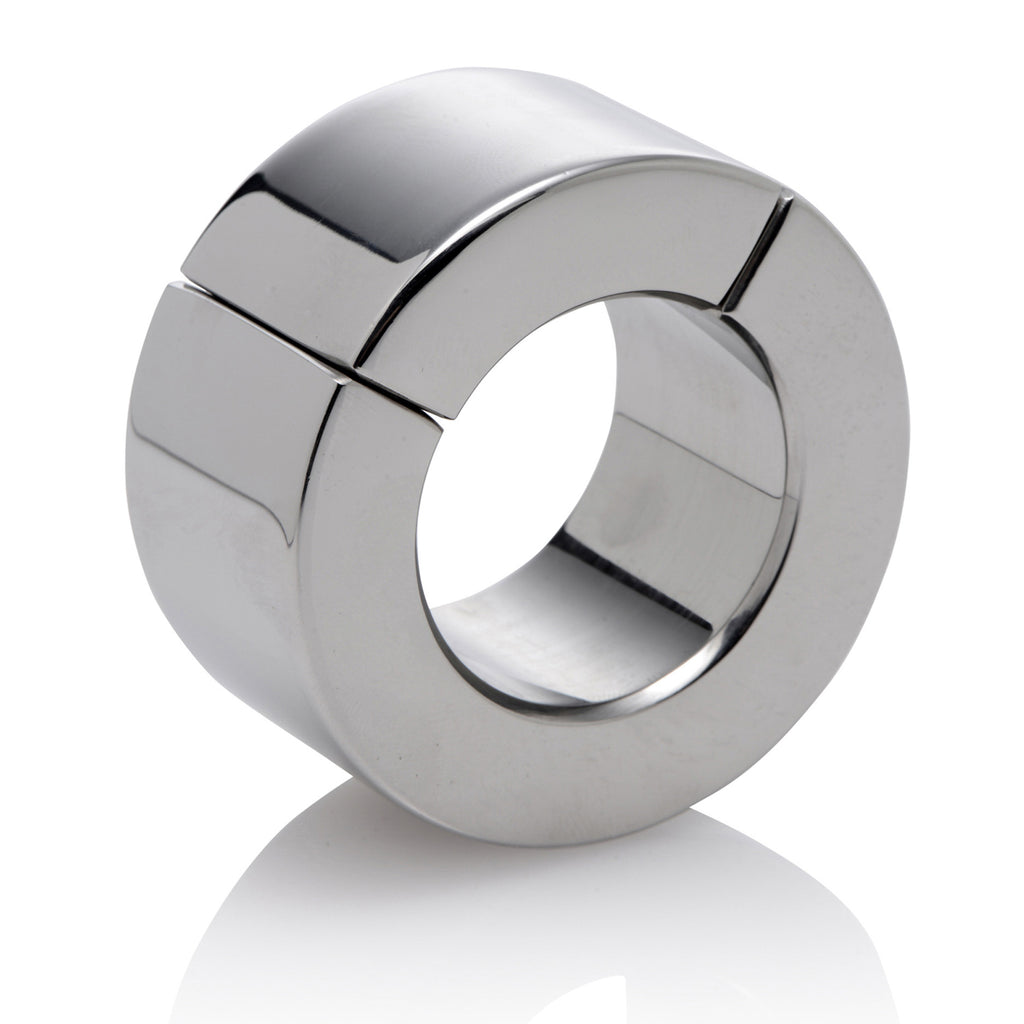 Whether you enjoy the weight and pull of a heavy ball stretcher during masturbation, or you are tormenting your sub with some CBT action, this heavy magnetic device is a unique and innovative new way to play! Pull the scrotum down away from the body and through the opening in the hefty stainless steel ring. Make sure all skin is against the back of the stretcher before replacing the magnetic closure. The stainless steel will clink loudly together, leaving the balls trapped in the heavy instrument. When you let go, it will yank down, pulling on the scrotum for an incredible sensation.