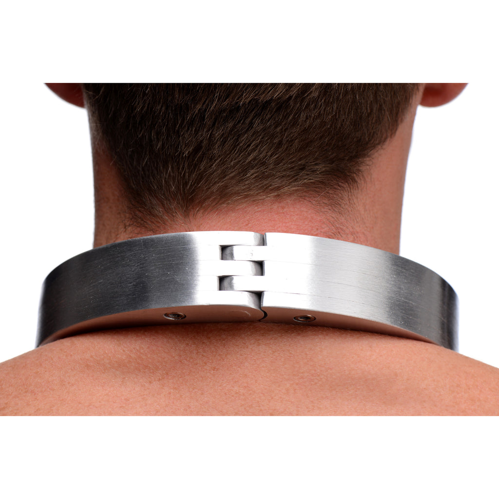 This heavy-duty piece of bondage equipment has a unique design, both in appearance and function. Similar to the restraint used in the film Logan, this restraint keeps your lovers hands immobilized in front of them. A single pin closes this contraption on your playthings neck and wrists. Secure the included lock through the pin to ensure that your partner is fully confined until you have had your way with them. Made of metal, this beautiful and intimidating piece will remind your captive of their place. This device works best on medium to large hands, as smaller hands may be able to escape the restraints.