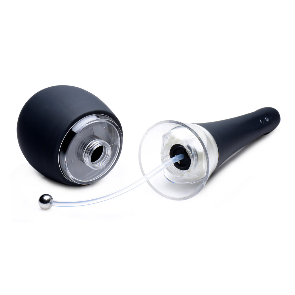 Cleaning out just got a little easier... and a little more fun! This automatic enema features 5 speeds of spraying power, all controlled with the push of a button. A total of 5 jet openings on the top and sides of the nozzle will squirt your walls with your solution of choice, with the added feature of a no-backflow design. The weighted internal hose allows for 360 degrees of use in any position. This enema is both rechargeable and waterproof for your convenience. Made of premium silicone, it is non-porous and phthalate-free. Use warm water and mild soap or toy cleaner for a thorough sanitization after use. Not compatible with silicone lubricants.