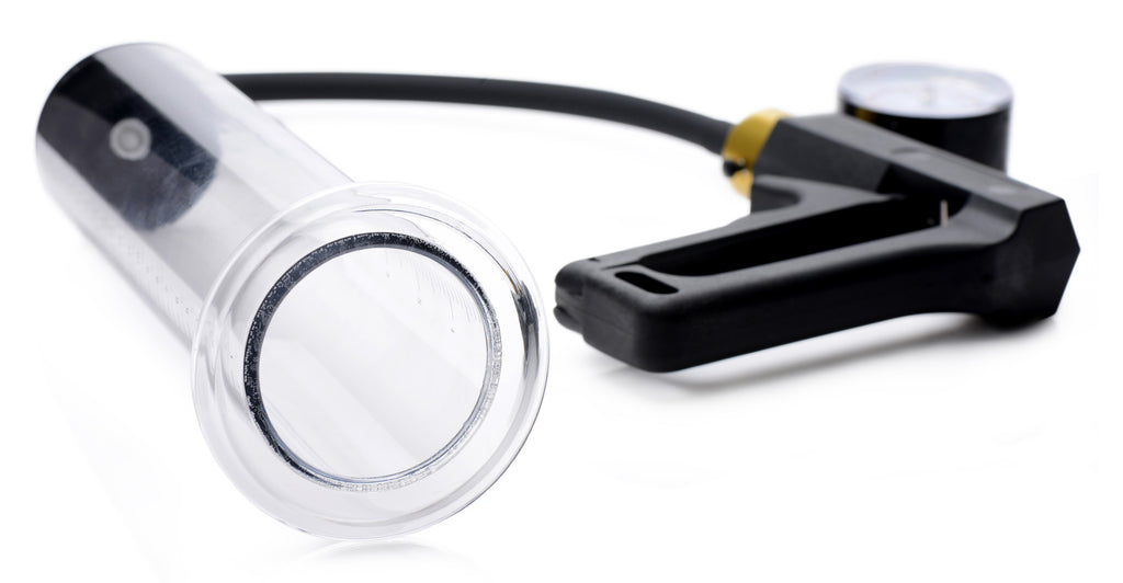 The pressure gauge will show your progress, but your penis will show it even more! This heavy-duty pumping set includes a 9 inch cylinder with measurements along its length to show your gains as you get longer and girthier. The extra wide base helps you create a tighter and more comfortable seal, made even easier with a little bit of lube. The ergonomic hand pump features a built-in pressure gauge, as well as a flexible and durable silicone hose. When you are satisfied with your engorgement, a quick release valve will instantly decrease the suction, freeing your ultra-sensitive penis for more hands-on play!