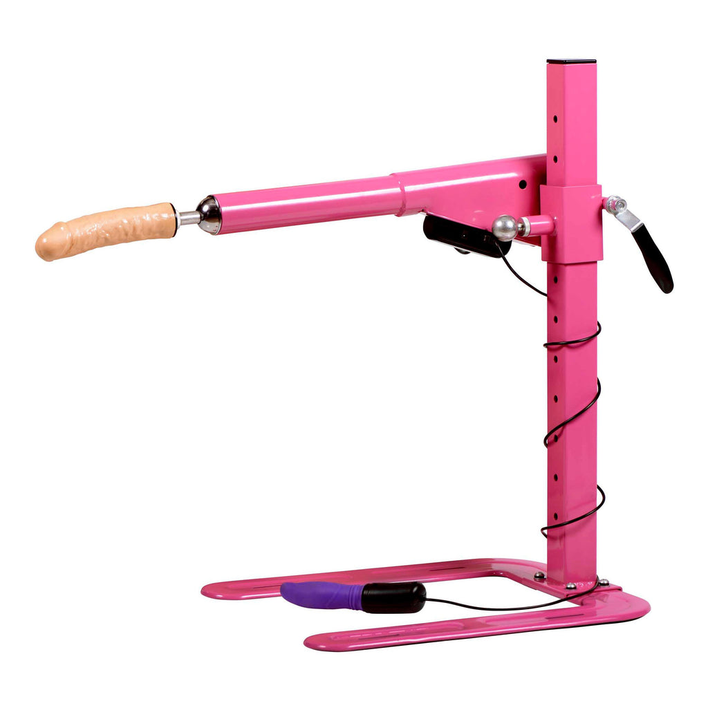 Measurements: Machine: 27 inches in height; Base: 20 inches in length, 16 inches in width; Thrusting arm: Adjusts from 6 inches to 22 inches in height; Stroke length with 7 inch attachment: Approximately 3 inches; Penis dildo: 7 inches in length, 2 inches in diameter; Anal dildo: 6.25 inches in length, 1.5 inches wide; Vibrating remote: 7.5 inches in total length, 4.5 inches insertable, 1.35 inches in diameter