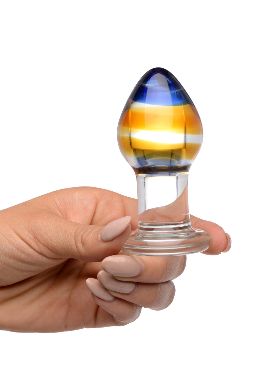 With its tapered end and wide body, the Pranava plug not only looks elegant, but also delivers incredible sensations! Uniquely handcrafted, this glass creation resembles and exclusive piece of art! Pranava begins at a gently rounded point, widening outwards before tapering at the neck. A flared circular base is flat-bottomed, allowing the toy to stand up on its own for solo play. Made entirely of Borosilicate glass, the Pranava is non-porous and easily cleaned with soap and water. Due to the high quality of this plug, you can also adventure into temperature play as the plug can be heated or cooled in water for a wide range of stimulation for you or your partner.