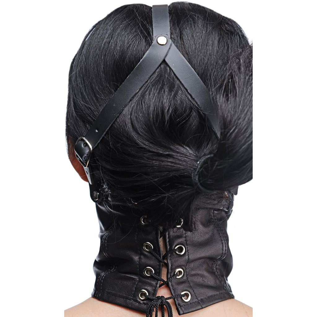This soft and comfortable leather neck corset laces in the back to fit most neck sizes, rising up in the front to cover the mouth of your submissive play thing. A soft, pillow-like gag sits at the front of the device, perfect for stuffing into their mouth to keep them quiet. Adjustable straps secure over their head for a fully-harnessed aesthetic and confinement.
