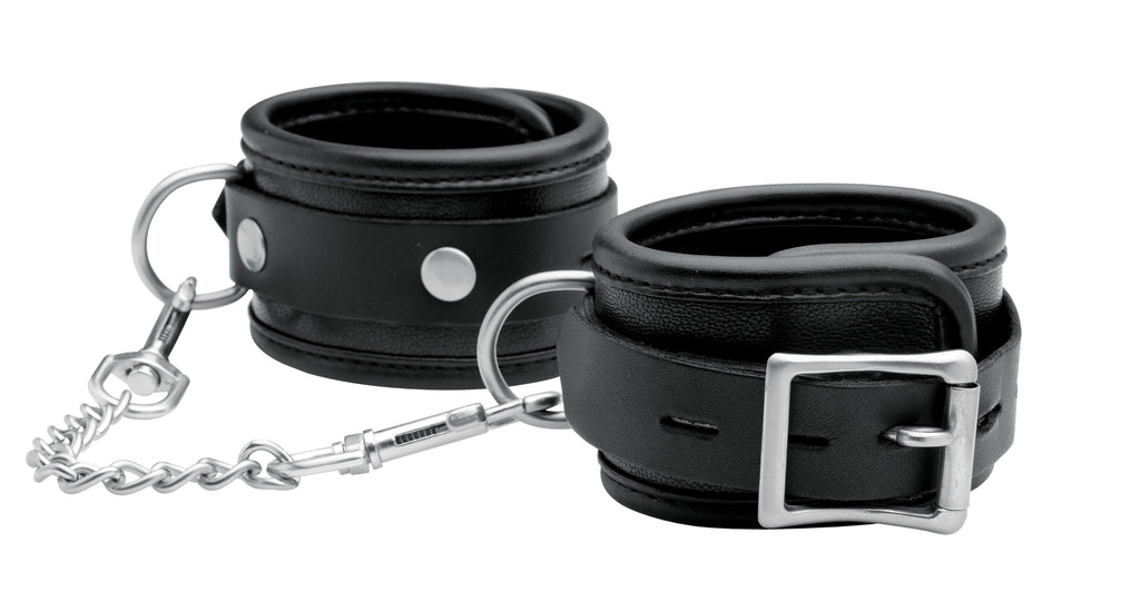 Made of durable, premium leather with a supple yet durable feel, these premium cuffs feature silver hardware, nickel-free metal, and an optional locking buckle for extra security. The snap hook chain at the center removes easily, and the D-ring allows you attach ropes, chains, or other accessories as you desire.