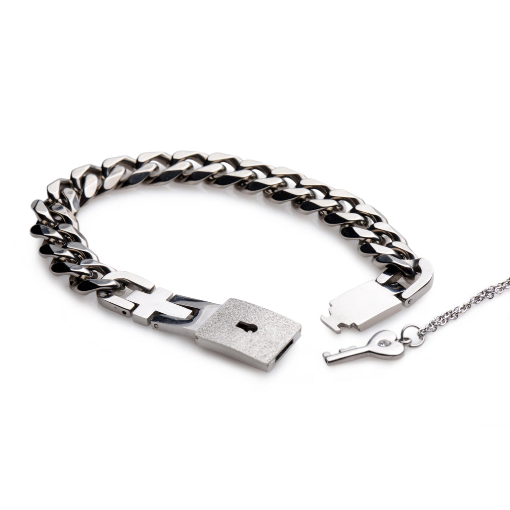 Ensure that your plaything never forgets they belong to you! The attractive and subtle design of this bracelet and key set makes it perfect to wear as a daily reminder of your Ds relationship. High-grade titanium steel forms a chain-link bracelet with a chrome lock built into the clasp, an accessory that can only be removed by their Master or Mistress. A dainty key adorned with a single gemstone hangs from a chain for you to wear upon your chest, reminding you of the pride and responsibility that comes with ownership. This beautiful set allows you to comfortably put your bond on display.