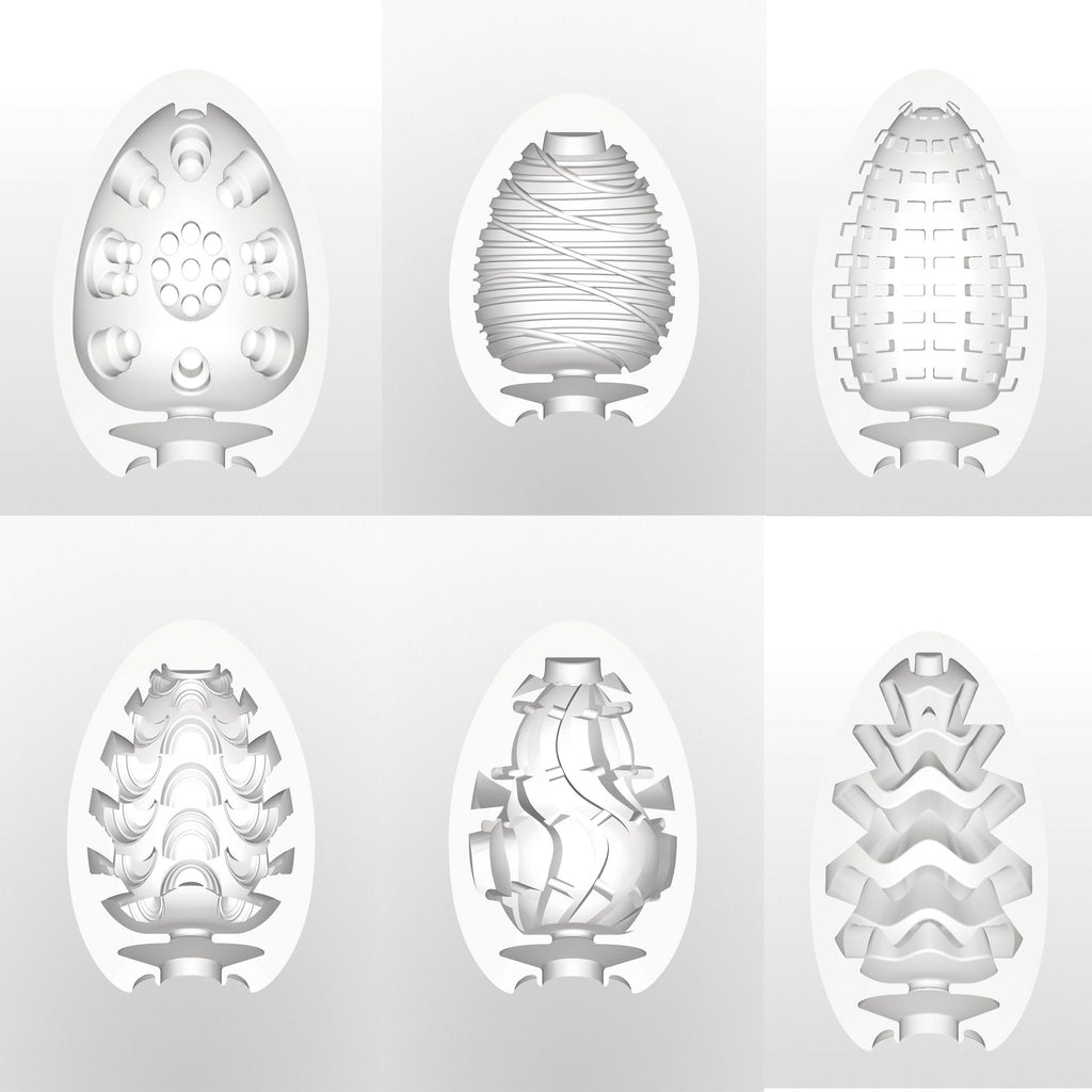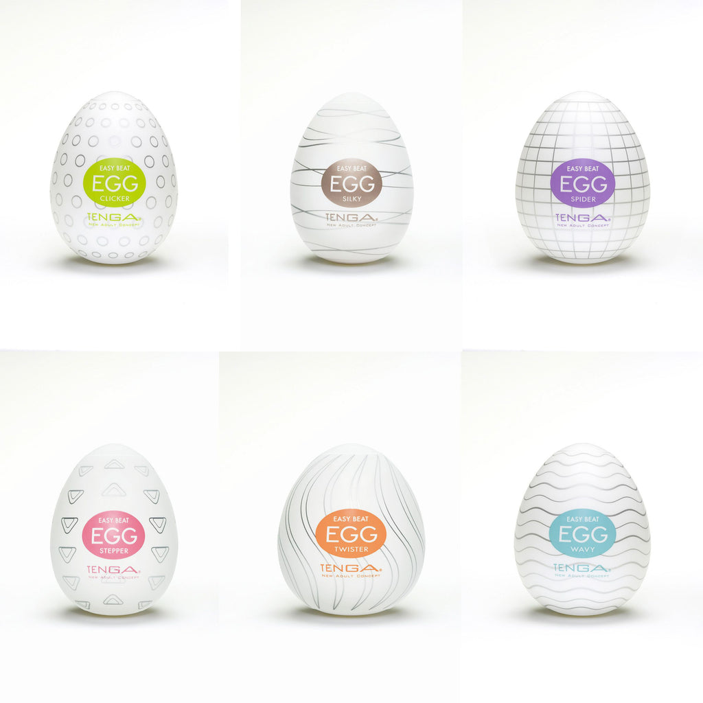 Different Strokes from Different Yolks! The TENGA EGG Series may look small, but their super-stretchable material can fit men of all sizes! The external designs of each EGG reflect the internal details within them! With a total of 6 eggs to choose from, you are sure to find a perfect match! This Variety 6 Pack contains 1 each of the following egg styles: Wavy, Clicker, Spider, Twister, Stepper, Silky.