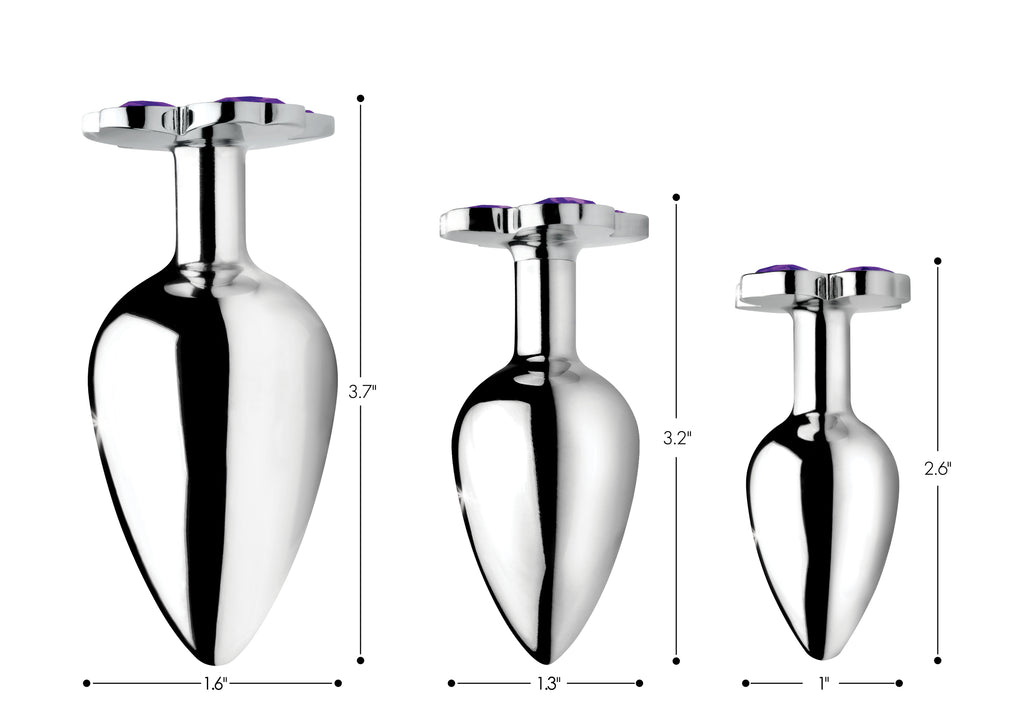 Who doesnt love flowers for a special occasion? The difference with this bouquet is that these violets will never wilt! Three different plug sizes allow you to take anal play at your own pace, or choose based on what you are in the mood for! Pop in each sleek plug to appreciate the comfortable weight inside your body, thanks to the nickel-free aluminum alloy material. Great for temperature play, you can warm or cool them in water before insertion. The attractive charm at the base will be a surprise for your partner when you bend over. Use with any lubricant of your choosing and clean after use with mild soap or toy cleaner.