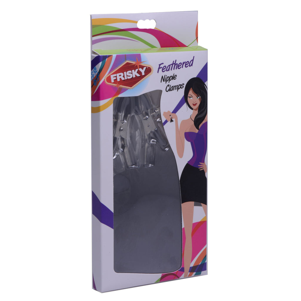 This set of adjustable nipple clamps are adorned with beautiful lightweight feathers, to tickle and please. The thumb screw allows you to control the tightness, with coated rubber tips for grip and comfort. Create a unique sensation and a visual delight with the Frisky Feathered Nipple Clamps