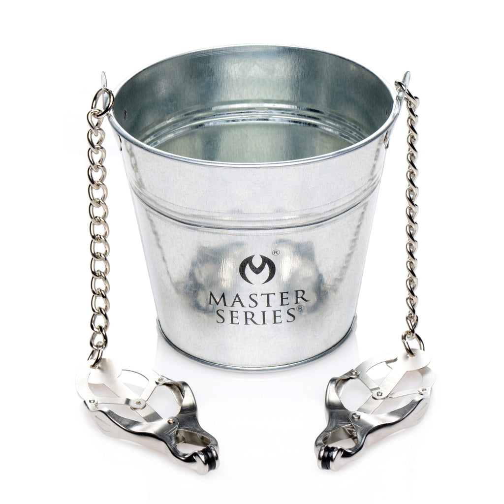 The Slave Bucket is the perfect BDSM accessory for wicked games with your partner. Combining the design of classic clover clamps with a bucket that hangs from chains, the more weight you add, the stronger the pinch and pull will be. Tease your sub with each pebble, coin, or drop of water that goes into the bucket. This devious device is perfect for nipples or labia, but can be used anywhere you desire!