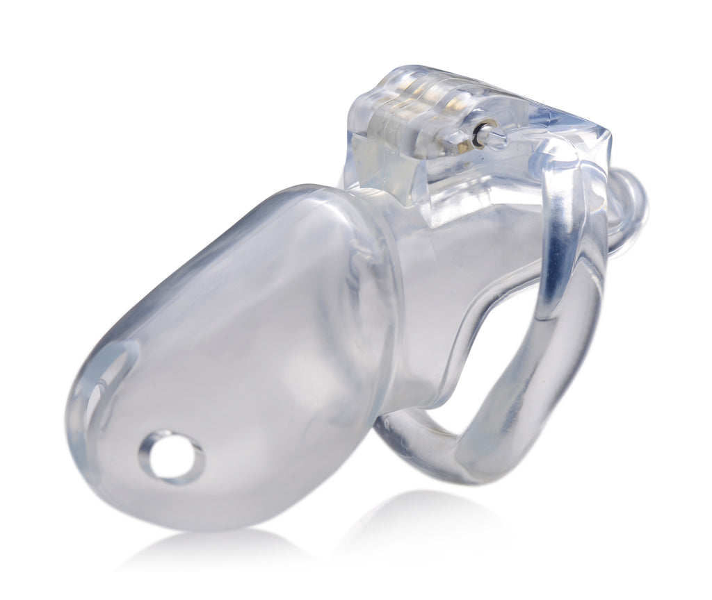 Confine your sub in this clear chastity prison! The Clear Captor locks your partners sexuality in clear view, preventing them from pleasuring themselves until you set them free. Made with forgiving materials for long term comfort, as well as a generous amount of ventilation holes and a pee through tip.
