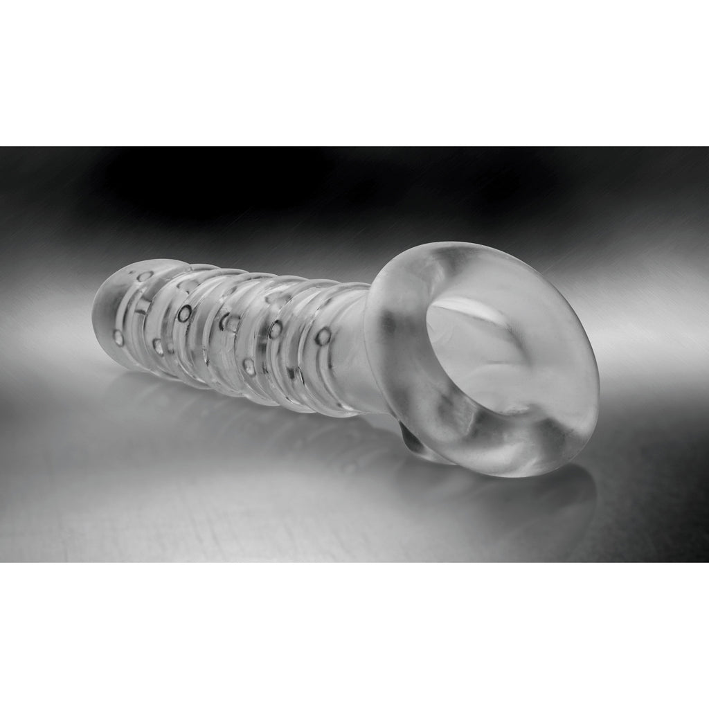Add length and girth to your erection with a textured enhancement sleeve! Penetrate your partner with a bigger dick when you slide into the stretchy extender, nubbed and ribbed internally for your intense pleasure. As you thrust into your lover, you will feel the delightful friction inside, while the external ribbing massages their hole. The ball strap feature includes a stretchy opening for your scrotum to fit through, keeping this phthalate-free sleeve in place and adding extra sensation. Clean with mild soap and warm water. Safe for use with both water-based and silicone lubes.