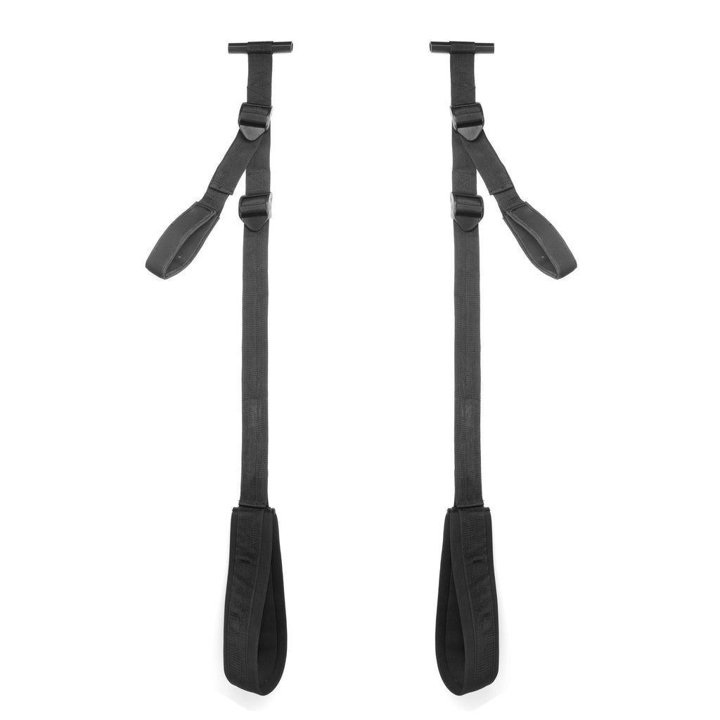 This simple, compact, and comfortable padded love swing just slips over the top of any doorframe, for multiple position possibilities in a super small package! Fully adjustable, it features two sturdy hand holds and two padded stirrups, which you can use for your feet or your legs. No drilling or installation required! Simply secure the dowel ends over the top of a sturdy, hinged door, and close it tight, being sure to pull on the swing to check that it is secure. Now you are ready to play! Holds up to 300 pounds, and the small size and versatile design makes it perfect for travel!