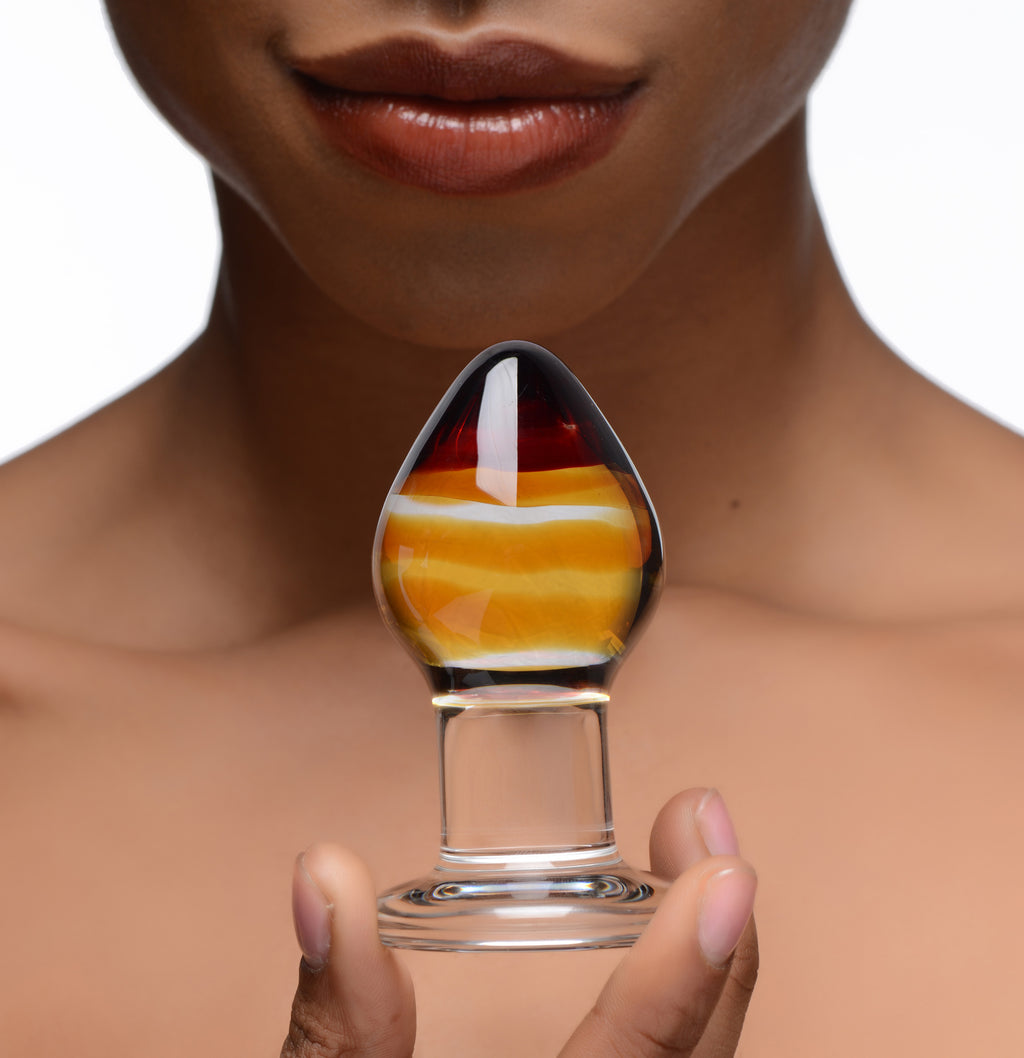 This uniquely handcrafted anal plug is designed for sensual comfort and is visually striking with its unique earthen hues. Agni begins at a gently rounded point, widening outward before tapering at the neck. The flared circular base is flat-bottomed allowing the Agni to stand up on its own for solo play. Made entirely of borosilicate glass, the Agni is non-porous and easily cleaned with soap and water. Can be sterilized by cleaning in a dishwasher.