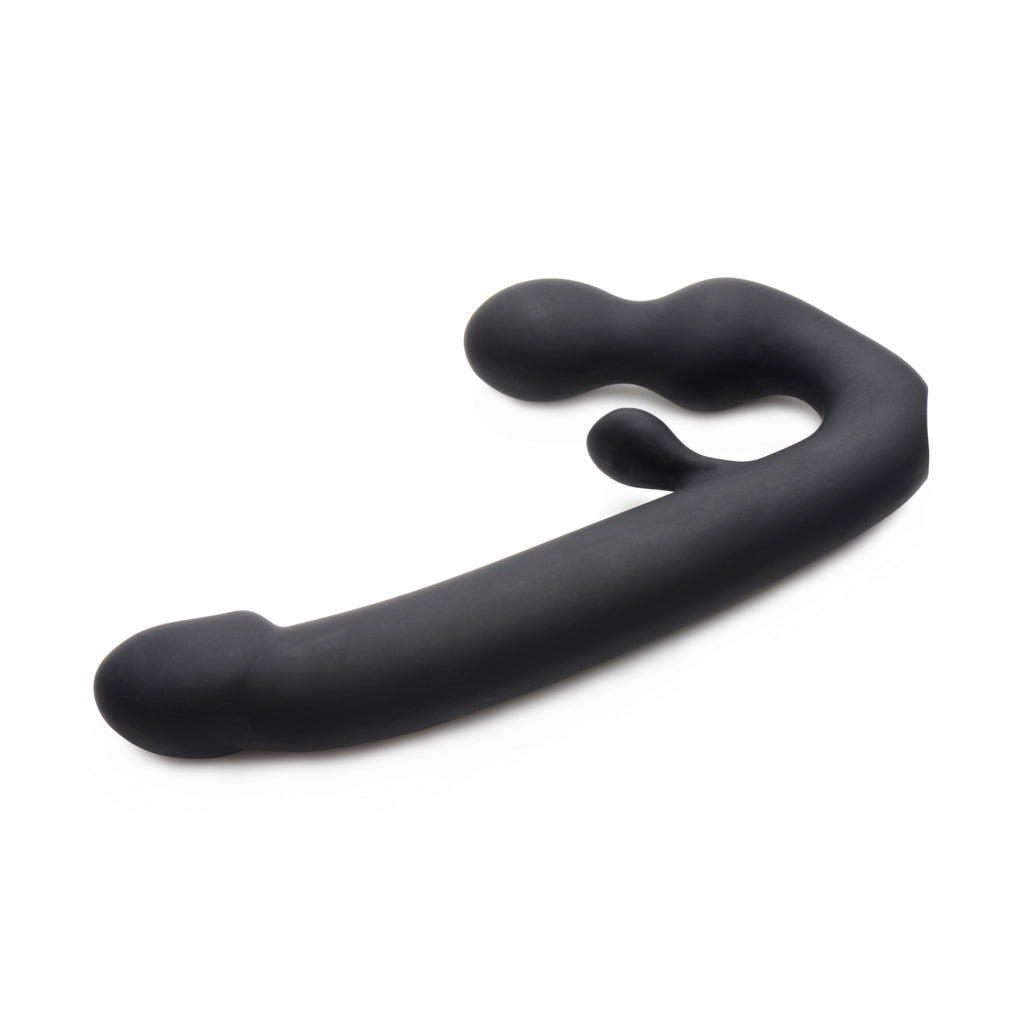 Both partners receive powerful pulsating pleasure from this double-sided strapless strap-on. A slender shaft, clitoral stem, dual bulbs for the wearer, and 7 incredible modes of vibration set this beautiful strapless strap-on apart! This rechargeable pleasure tool features dual motors to provide you with 3 speeds and 4 patterns of powerful internal thrumming. The single control button is easy-to-use and accessible during penetration. Both ends of this artfully designed double dildo are shaped for the ultimate in ecstasy: the smaller end features two smooth swells while a protruding stem massages the clitoris. Meanwhile your partner will be treated to a narrow, comfortable shaft with a bold coronal ridge. It is even waterproof so that you can take your play into the shower, bath, pool, and more! Explore greater intimacy with a vibrating double-ended strapon dildo. Made of silky silicone, the Tri-Volver is non-porous and phthalate-free. Clean with mild soap and warm water and avoid use with silicone lubricants.