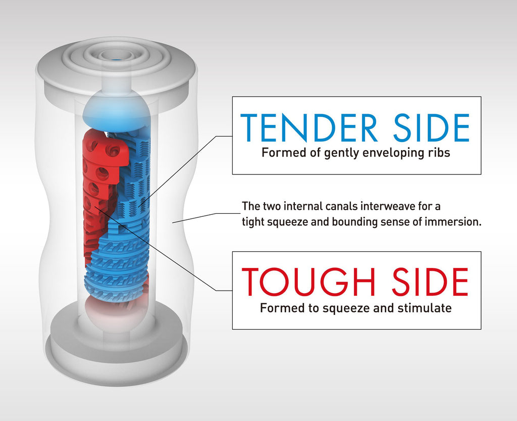 A two-in-one blend of stimulation! The Bitter Side firmly tightens while the Sweet Side gently clings to your shaft. Normal use is one side at a time; however, simultaneous use of both will provide a brand new feeling of two contrasting sensations! To create a strong internal vacuum, simply remove the sticker at the top of the cup before use and cover with your finger while using. Cup features the smooth pad insertion mechanism! This mechanism not only offers extra adherence, air-tightness and less lubricant leakage, but will automatically apply lubricant to your shaft as you insert!
