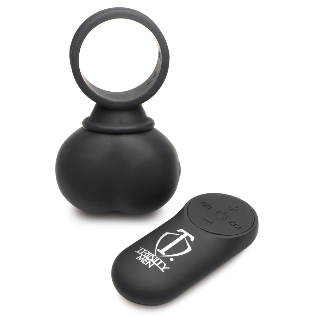 Add more fun to your play and get some vibrating balls to strap on to your toy or partner! These heavy balls are made of phthalate-free, premium grade silicone so they are body-safe and compatible with water-based lubricants. The plush, silky smooth design is also rated at IPX5 waterproof so you can enjoy them in the shower! The ring can be used either as a cock ring for your partner, or strapped around any dildo or vibrating insertable. Enjoy 4 speeds and 7 patterns of rumbling vibration that you control with the battery operated remote control. Wash with warm water and soap after use, then spray with a toy cleaner and wipe dry. Recharge the vibe using the USB cable provided.