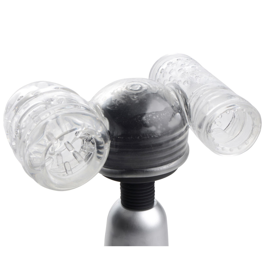 Transform your favorite massage wand into a male sex toy with an accessory that gives you two ways to play! Perfect for masturbation or use with a partner, this attachment slips easily over the head of a standard sized wand vibrator, providing two textured strokers that will thrum with the same incredible power as your massager. One stroker features a closed cup to target the head of the penis for pleasure, lined with soft tendrils to tickle and tease. The other stroker is open-ended to pleasure the entire shaft, lined with stimulating nubs for a massage with every thrust. Enjoy an intense vibrating experience, solo or shared! Made of phthalate-free TPE, this pleasure tool can be used with both silicone and water-based lubricants.