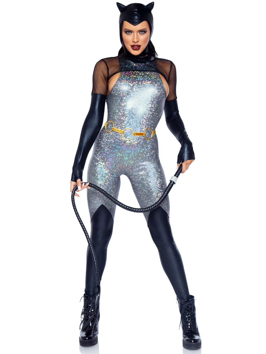 4 PC Feline Felon, includes holographic catsuit with boot detail, fishnet gloved shrug, cat ear skull cap, and belt.