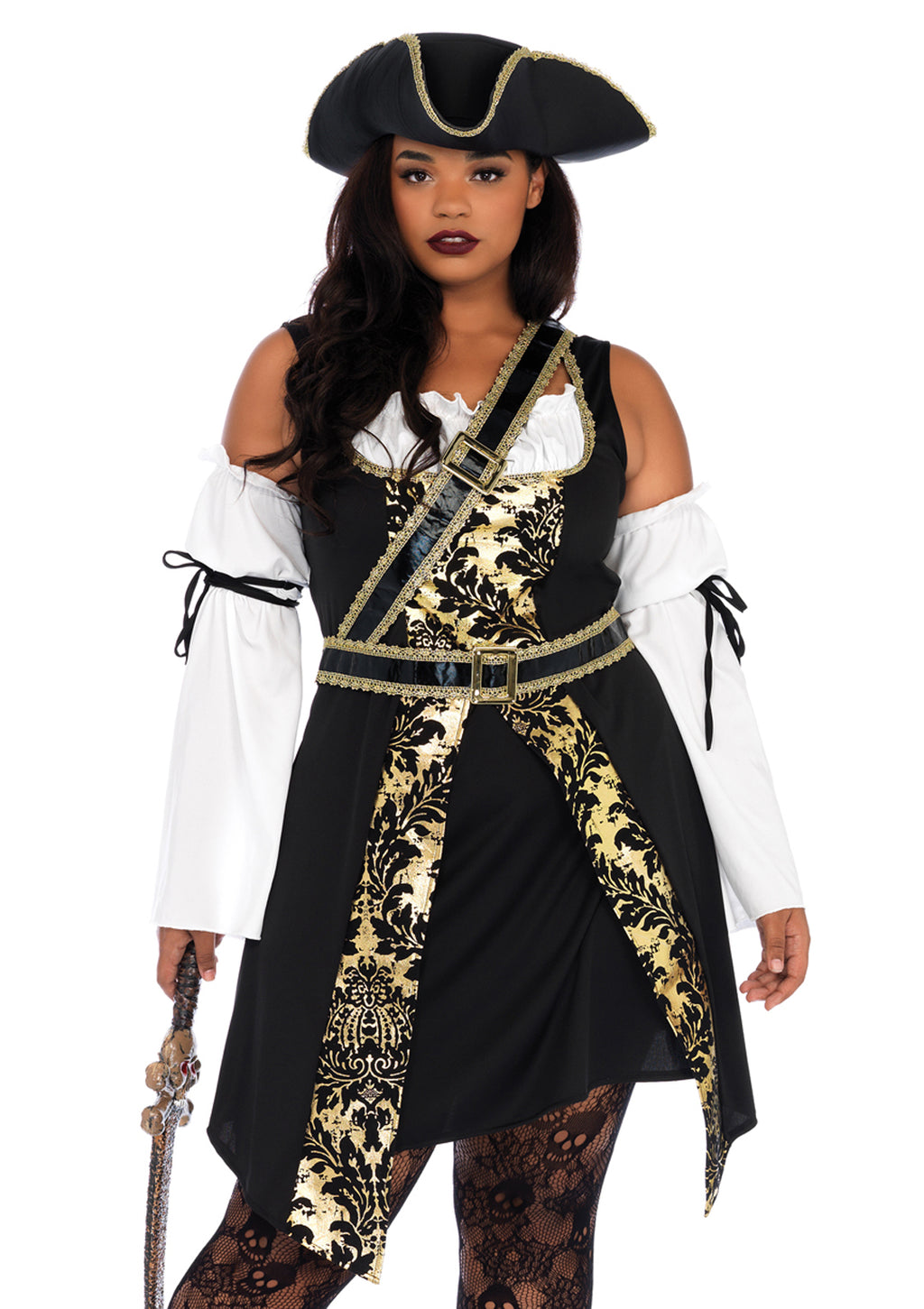 4PC.Black Sea Buccaneer,dress w/gold brocade trim, sleeves,crossbody belt and hat