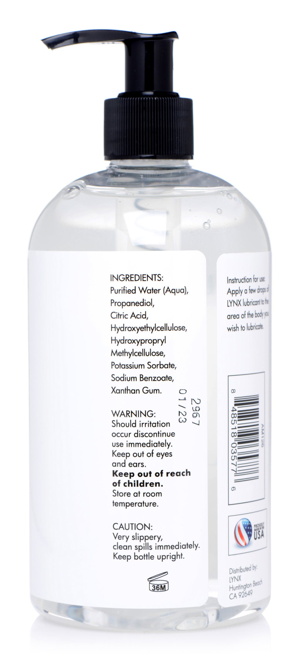 Lube up your toys, body parts, and insertables with this Lynx water based lubricant! Coming at a generous 16 ounce size for months of slippery goodness and a convenient pump top for easy access and re-application during your fun time.